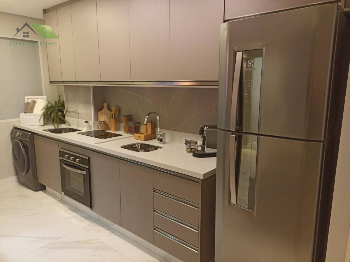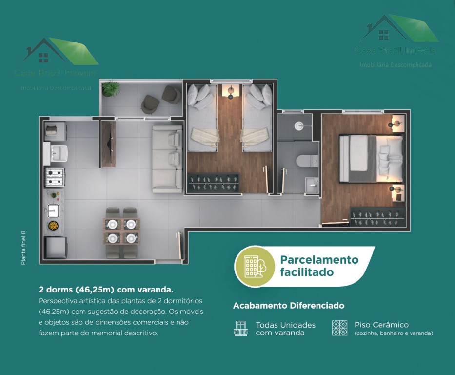 2 dormitórios, sala com sacada, cozinha, banheiro, área de serviços e 1 vaga