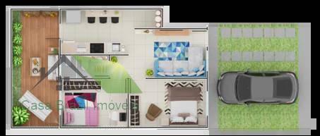 2 Dormitórios, sala, cozinha, área de serviço, quintal e vaga de garagem.